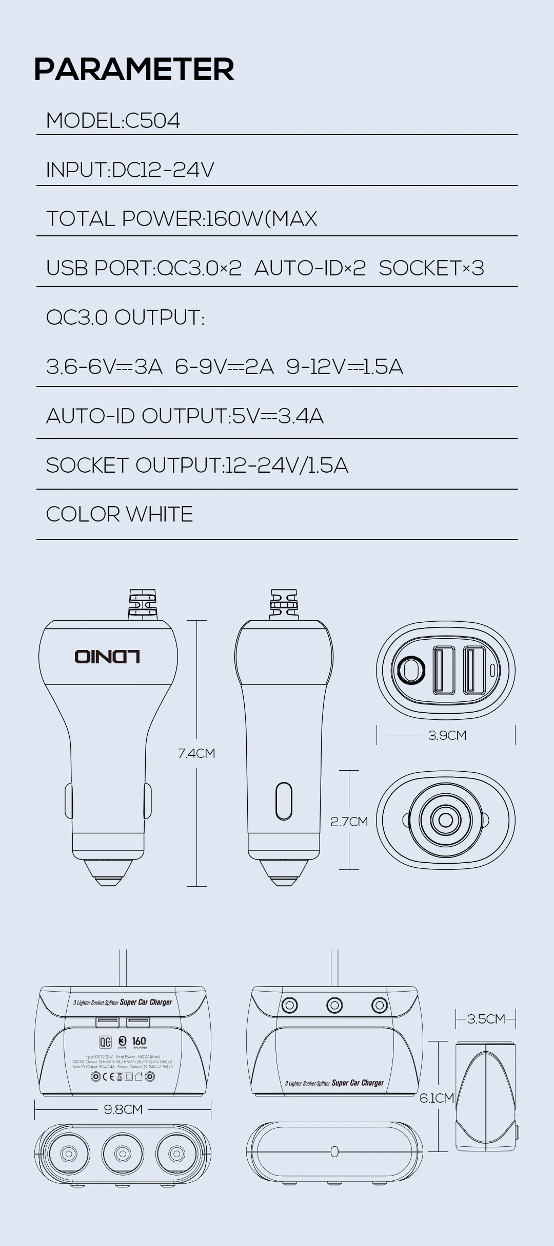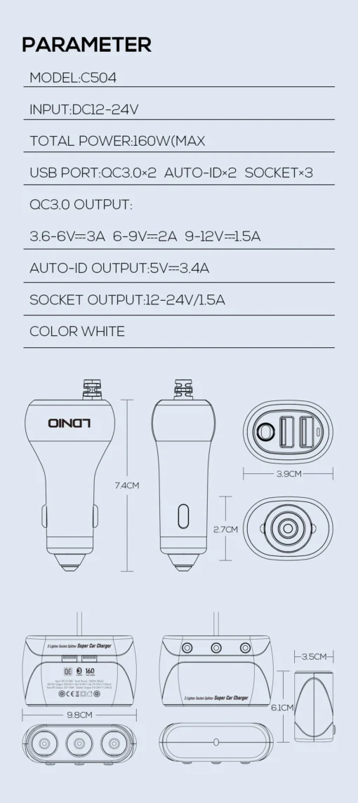 C103 | شاحن السيارة السريع بقوة 60 وات من LDNIO – قوة وأمان أثناء التنقل مع كبل تايب سي الى تايب سي المجموع: 375٫00 EGP