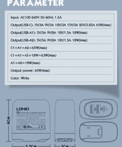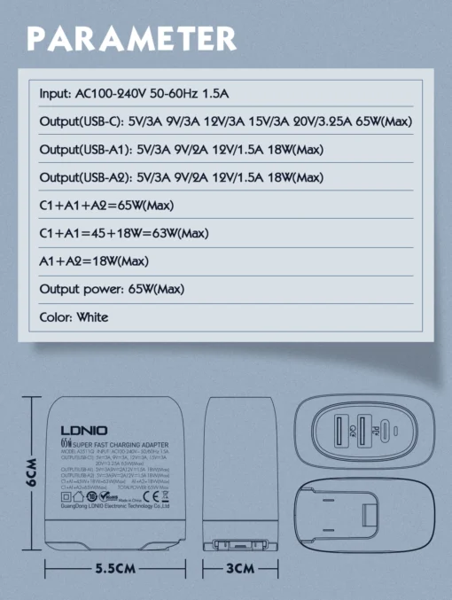 *3-Port USB (2A1C), PD (65W) + QC3.0 (18W) + Auto-ID (18W), total power 65W