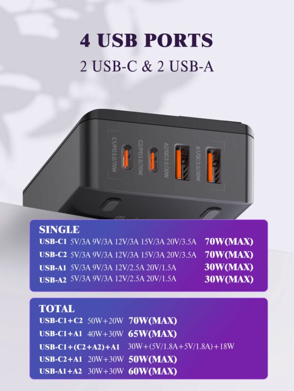 - Four-port design (2 USB-C + 2 USB-A) enables simultaneous charging of up to four devices