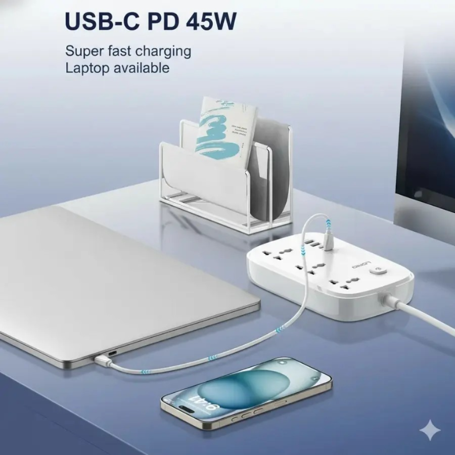 The LDNIO SC6 Power Strip is not just about powering devices—it’s about charging them quickly and efficiently. It features a total of five high-speed charging ports, including two USB-C PD ports and two USB-A QC3.0 ports. The USB-C ports are capable of delivering up to 45W of power, making them perfect for charging laptops, tablets, and other USB-C-enabled devices at full speed. The USB-A ports support Quick Charge 3.0 technology, offering up to 40W for smartphones and accessories that support fast charging.