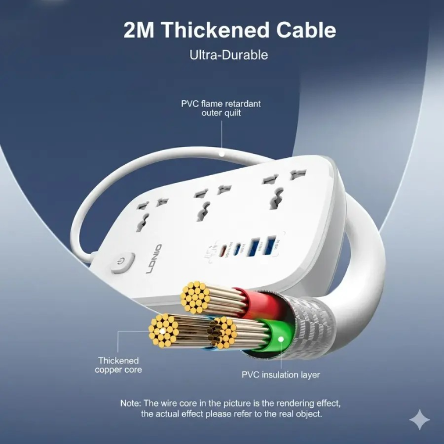 The LDNIO SC6 Power Strip is designed with practicality in mind. Its 2-meter heavy-duty extension cord provides ample reach, allowing you to position the power strip exactly where you need it. Whether you’re plugging in devices across a large desk, reaching behind furniture, or setting up in a workshop, the flexible cord ensures easy access to power.