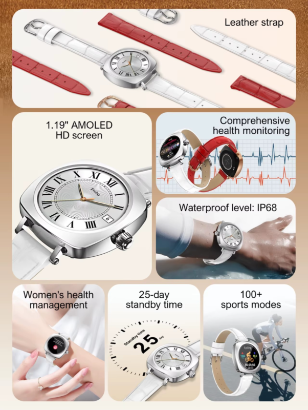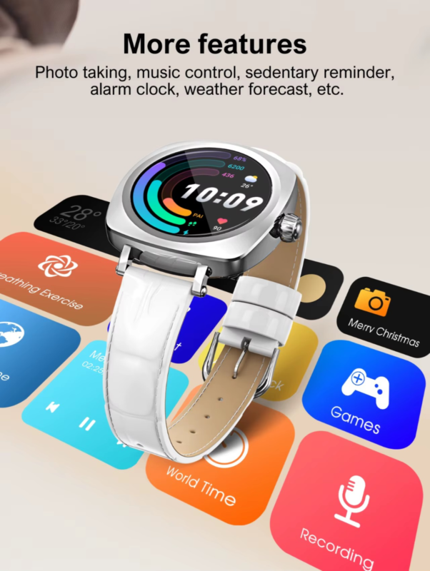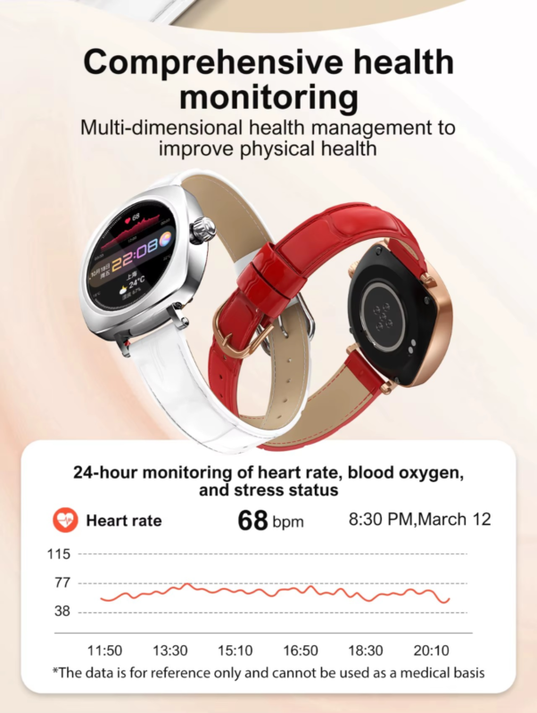It has various functions such as heart rate detection, exercise recording, and menstrual management for women.